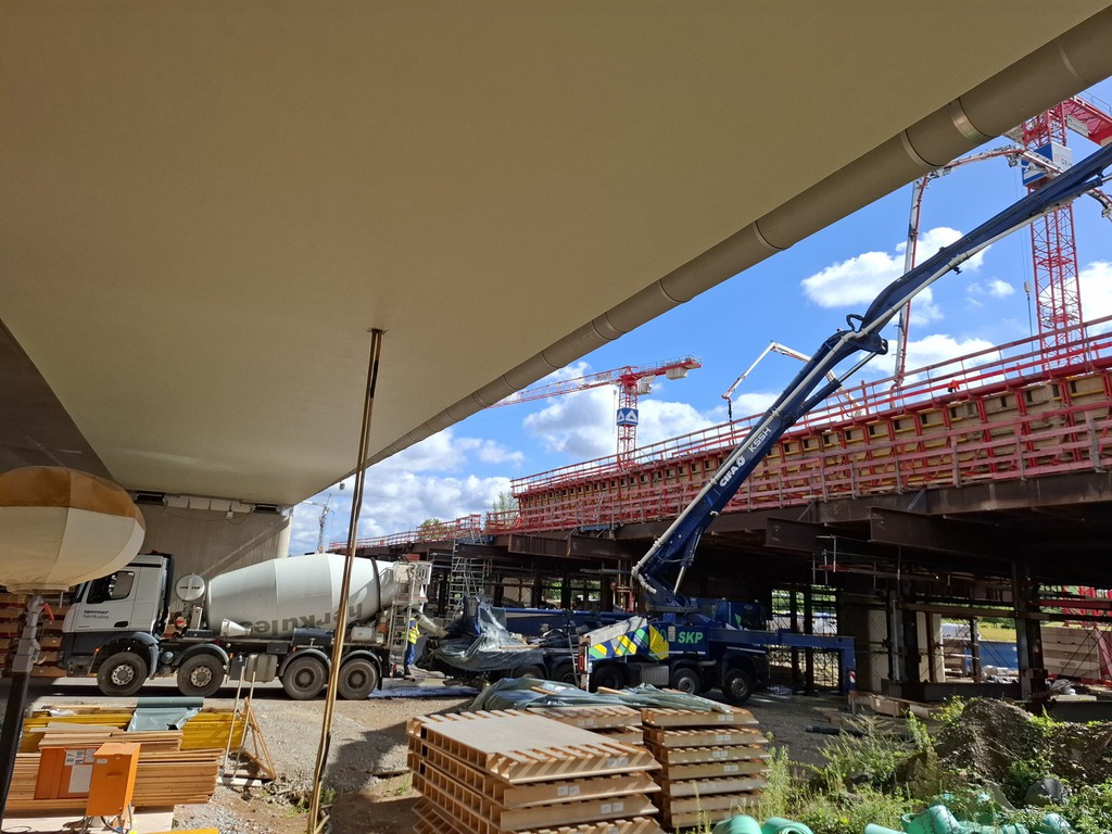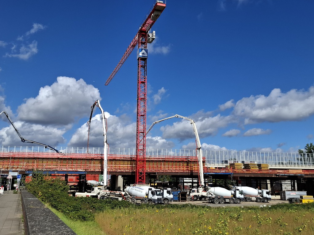 Über der Merkenicher Hauptstraße wird auf der Brücke Betoniert