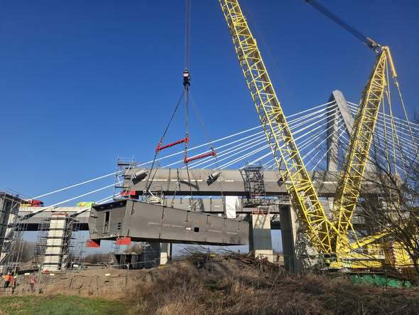 Erstellen der neuen Autobahnbrücke laufen auf Hochtouren, Stahlteile für die neue Brücke (über den Rhein) wurden angeliefert.